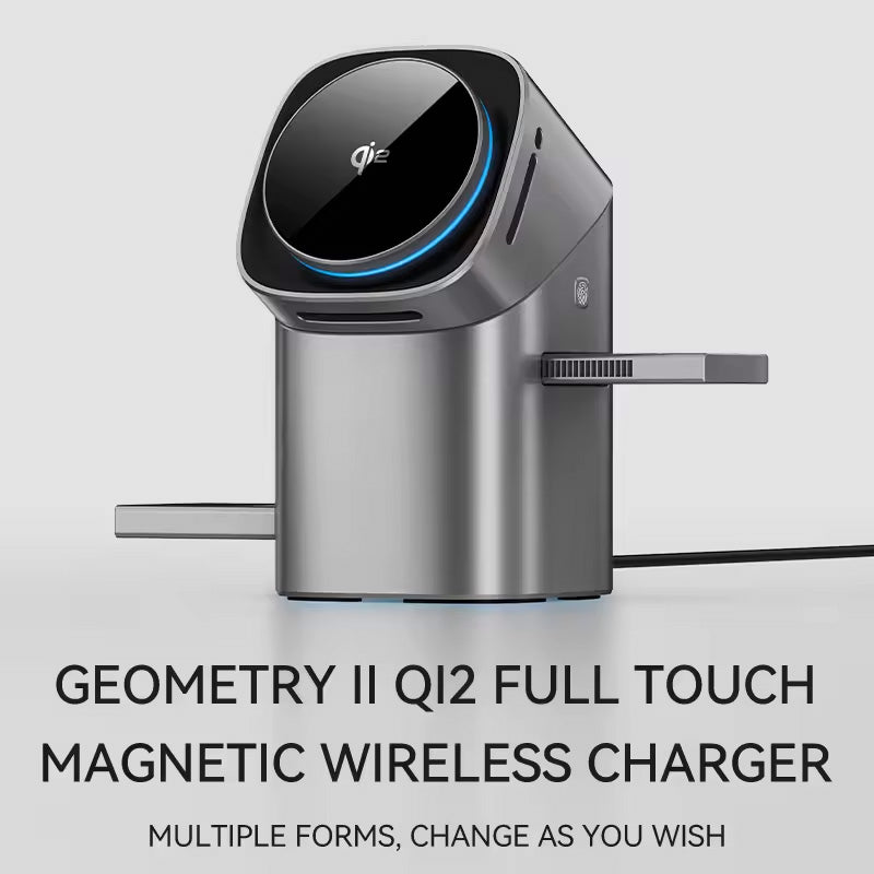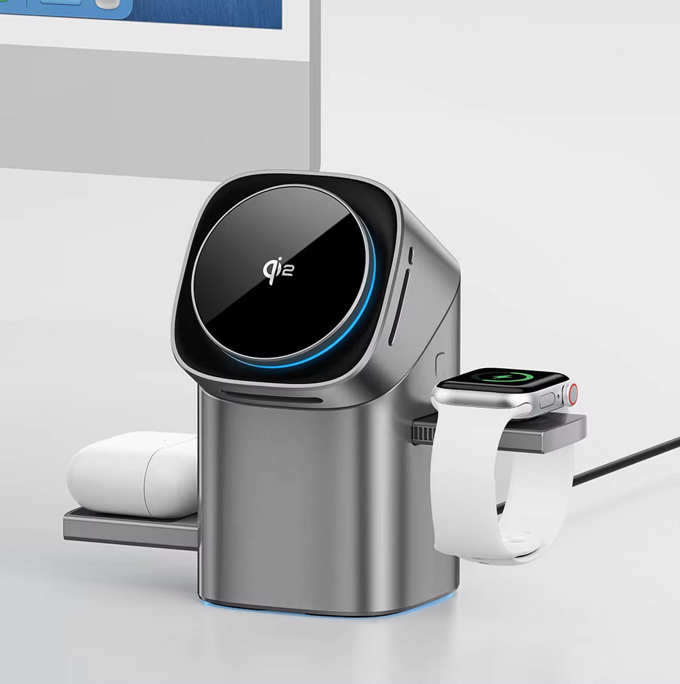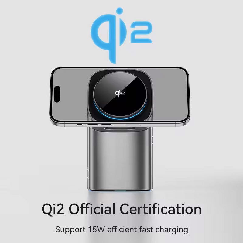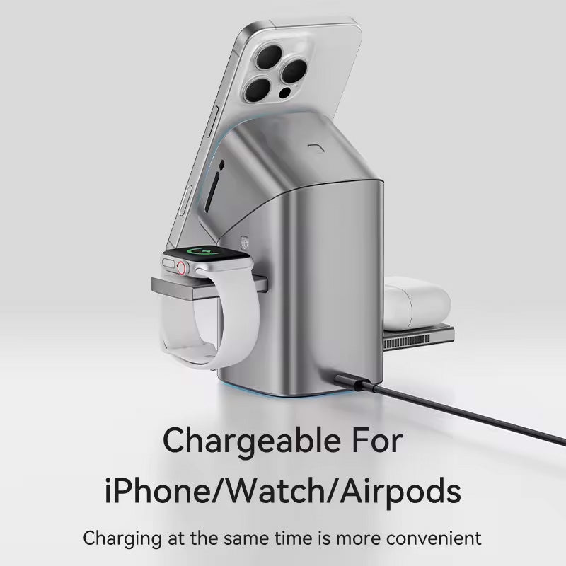 Karikues inteligjent 3-në-1 me teknologji Qi2 për karikim të shpejtë dhe të sigurt të iPhone, Apple Watch dhe AirPods njëkohësisht. Me fuqi deri në 15W për telefonin, 2.5W për kufjet dhe orën, ky karikues eliminon rrëmujën në tavolinë. Dizajn elegant me guaskë prej xhami të kalitur, mbështetje magnetike për vendosje të saktë, rrotullim me prekje dhe ruajtje të palosshme për kursim hapësire. I përshtatshëm për të gjitha pajisjet me karikim wireless.
