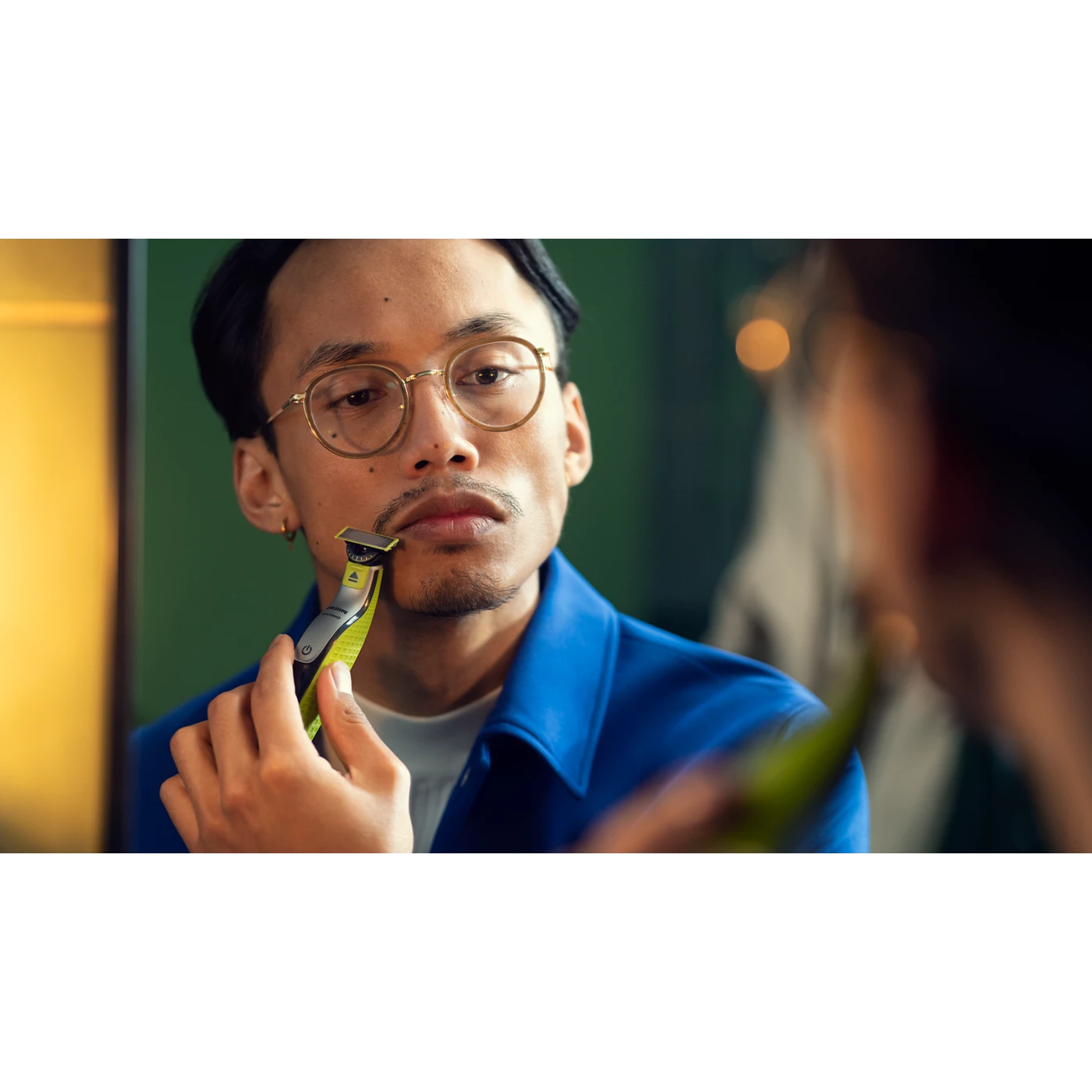 OneBlade 360 i ri pret, stilon dhe rruan çdo gjatësi të qimëve – më e lehtë se kurrë. Tehu inovativ me teknologji 360 mund të rrotullohet në të gjitha drejtimet për të ndjekurkonturet e fytyrës suaj.