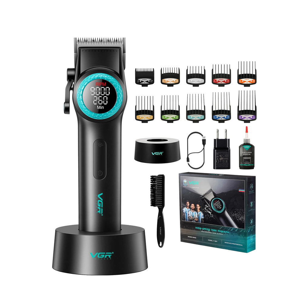 VGR V-001 është një makinë profesionale për prerjen e flokëve dhe mjekrës, e pajisur me teh çeliku karboni për prerje të pastër dhe precize. Me 10 krehrë kufizues dhe një levë rregulluese për gjatësitë nga 1 mm deri në 27 mm, kjo makinë ju mundëson stilim të personalizuar dhe të saktë. Motori i fuqishëm dhe i qetë punon me shpejtësi të rregullueshme nga 7,000 deri në 9,000 RPM, ndërsa bateria e fuqishme 4600mAh ofron deri në 260 minuta përdorim pas vetëm 3 orë karikimi. Ekrani LED inteligjent tregon shpejtësinë dhe kohën e mbetur të funksionimit, dhe drita ndihmëse ju siguron prerje të saktë edhe në ambiente me ndriçim të ulët.
