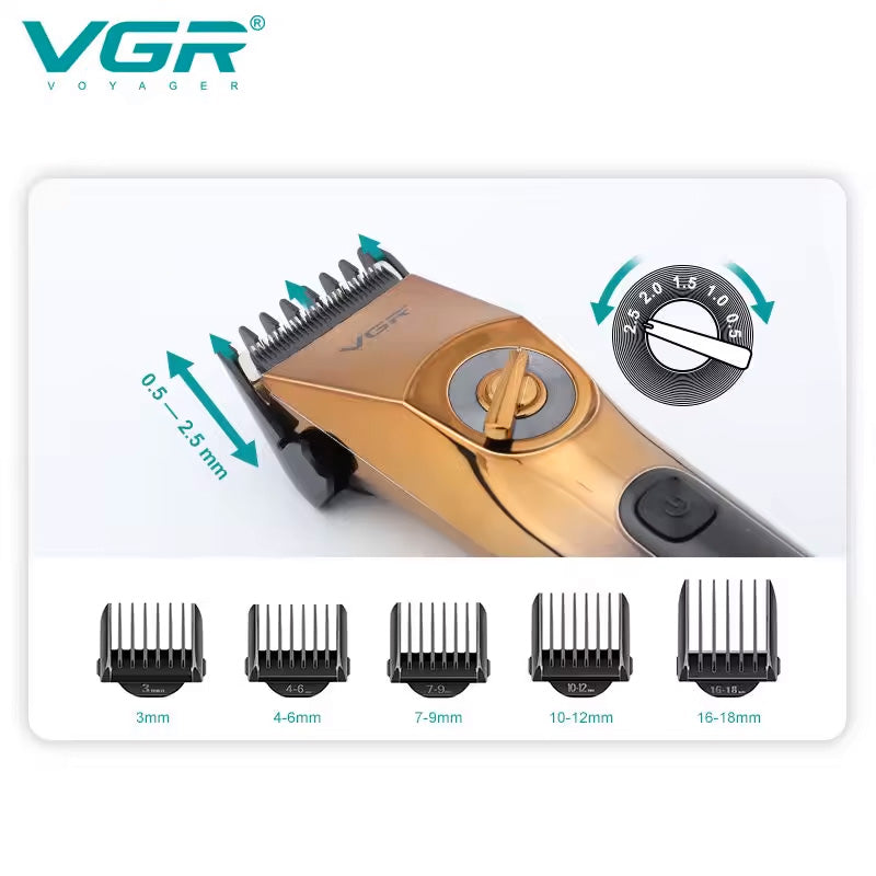 VGR V-663 – Makineri profesionale për flokë me tehë qeramike & titani, 5 nivele prerjeje + 6 krehera