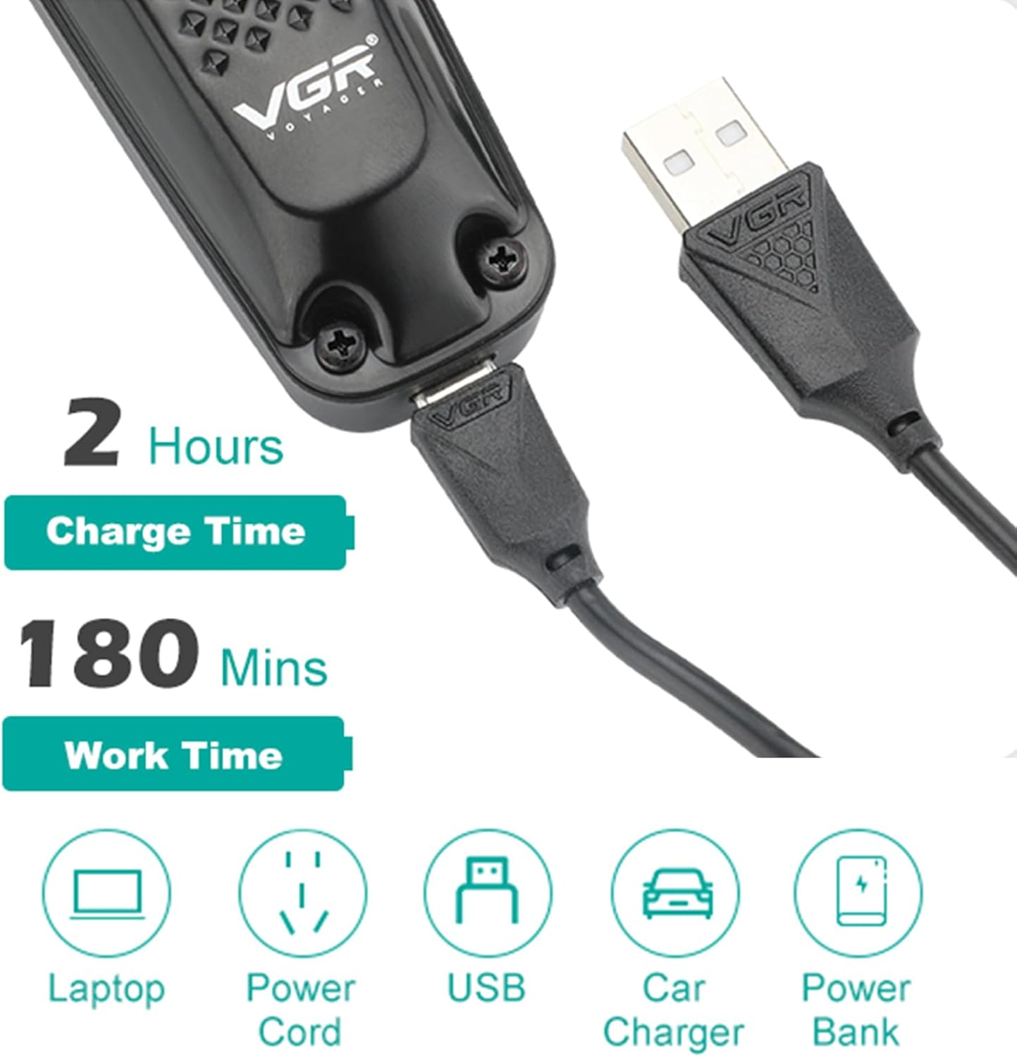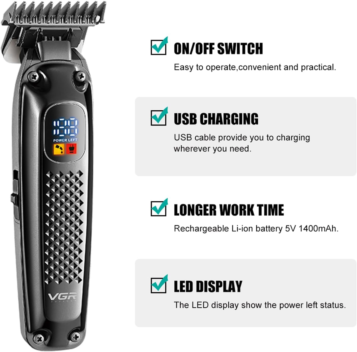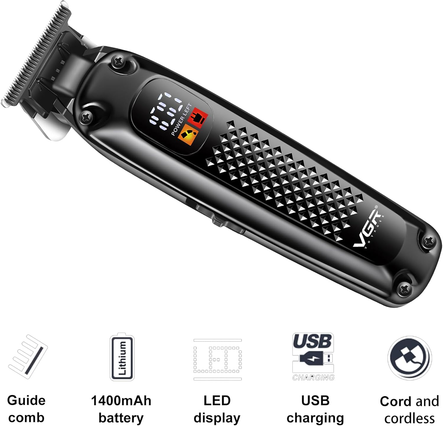 VGR V-972 – Trimmer Profesional për Mjekër & Flokë, Teh Qeramike, LED Display, Bateri 1400mAh, 180 Min Përdorim, Pa Kabllo & Me Kabllo, Karikim USB