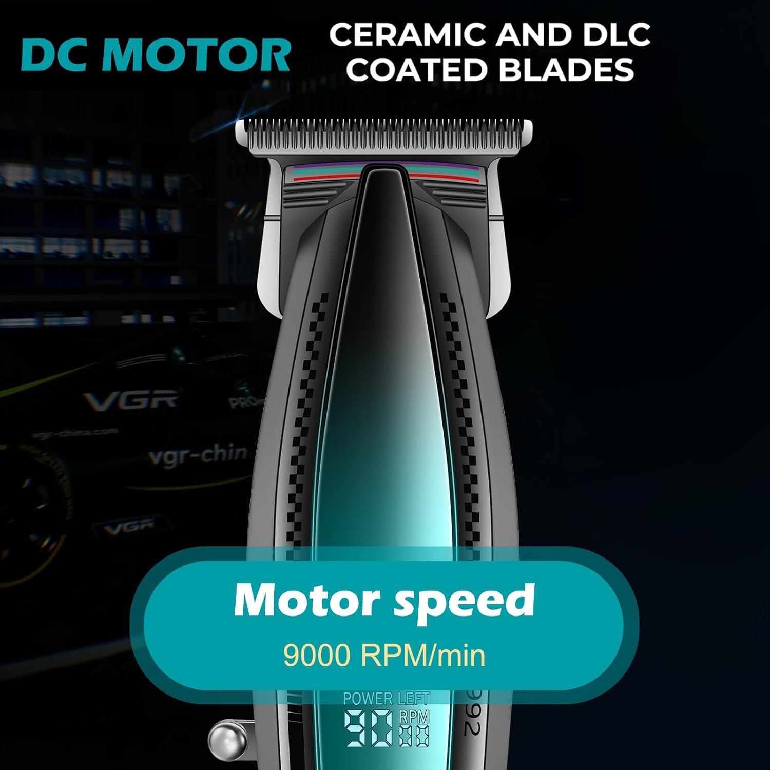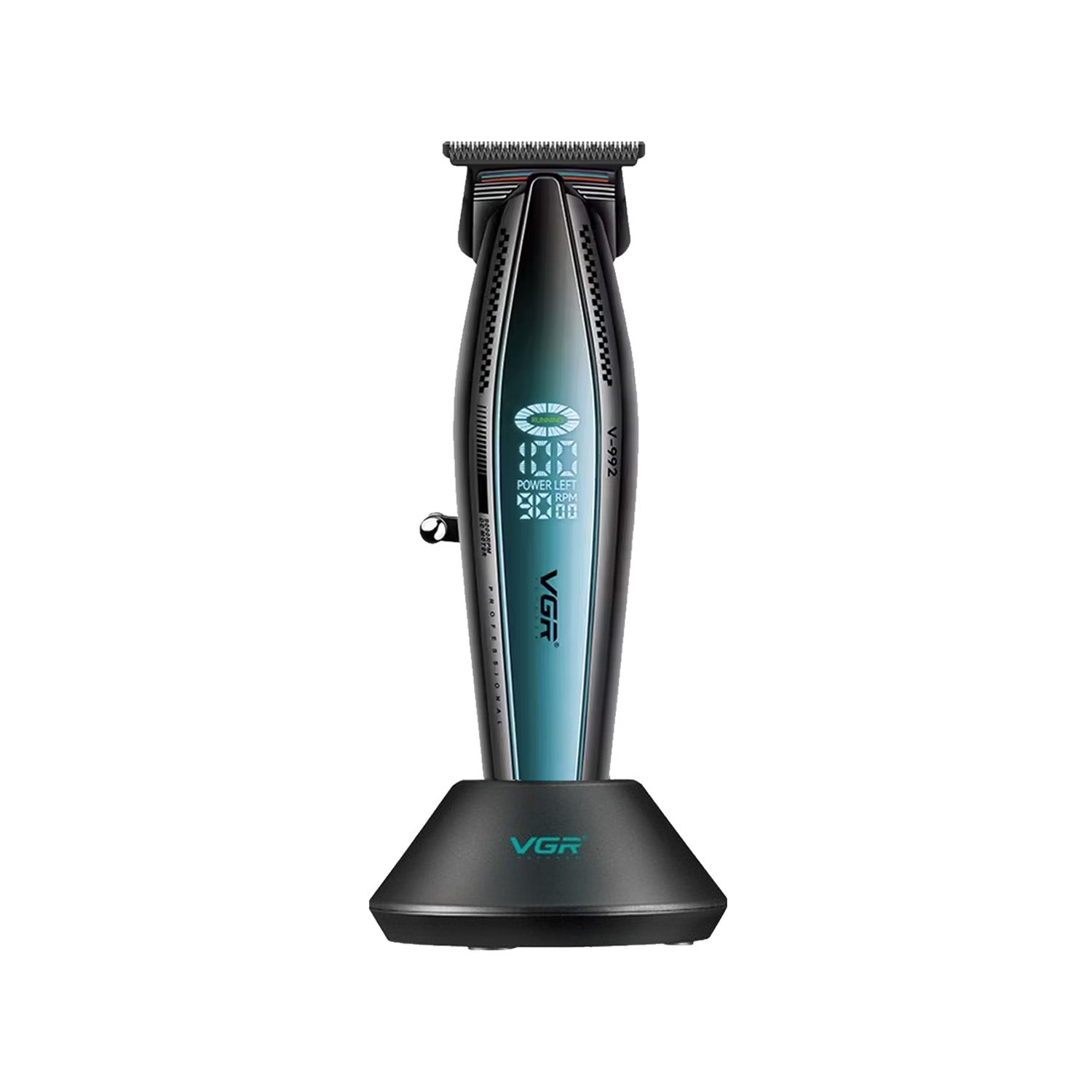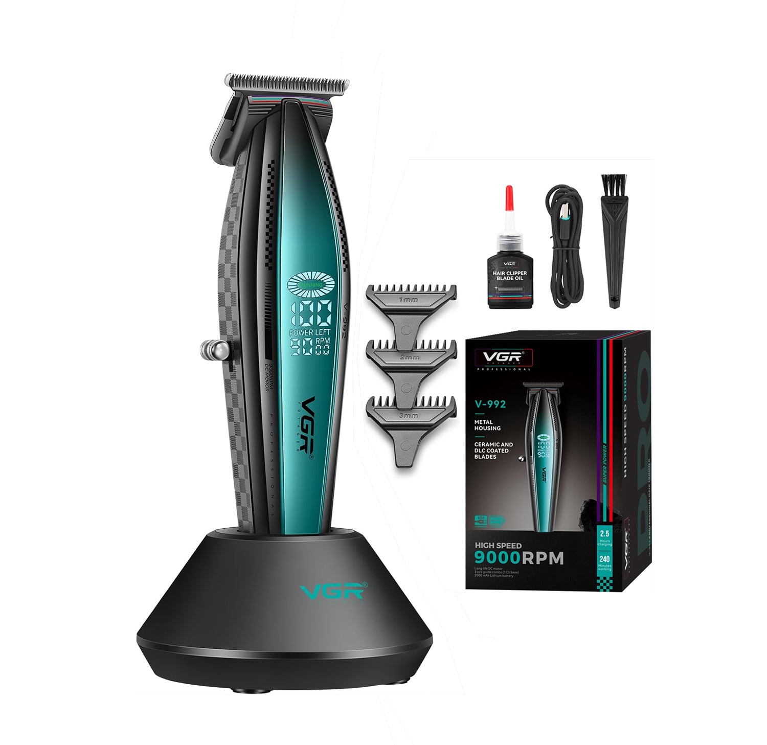 VGR V-992 – Trimmer Profesional Zero Gapped, T-Blade Outliner, 9000 RPM, Metal Body, Bateri 2000mAh, 240 Min Përdorim, Pa Kabllo, Ekran LED, Karikim USB & Dock